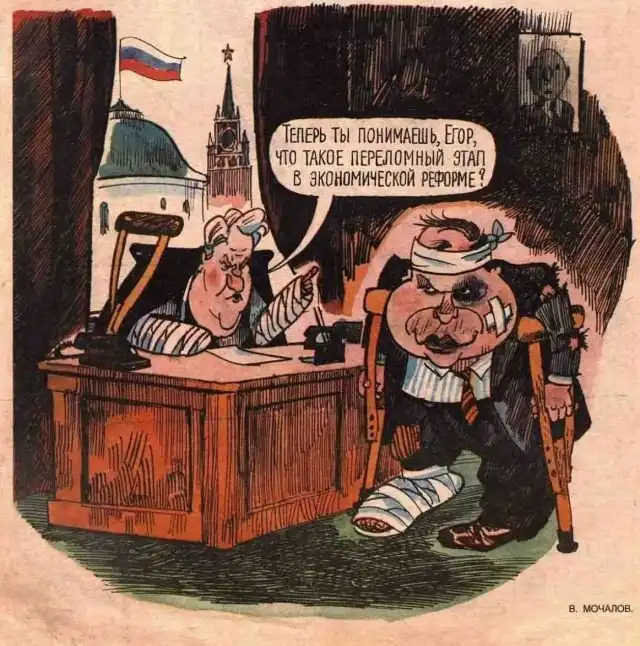 Карикатура на Бориса Ельцина и Егора Гайдара из журнала "Крокодил", 1992 год.
