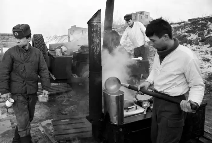 Воронежская обл. Богучар. 10-я танковая дивизия выведена из Германии. Полевая кухня. Февраль 1994 года.