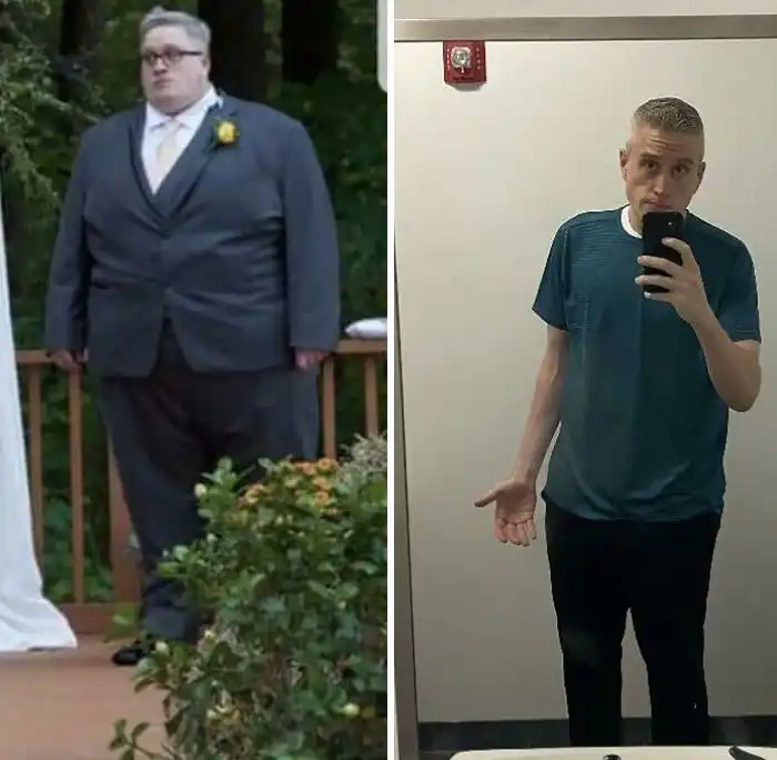 6. "Фото слева — это я ровно три года назад, шафер на свадьбе друга. Тогда я весил около 270 килограмм. Сейчас яя вешу примерно 105"