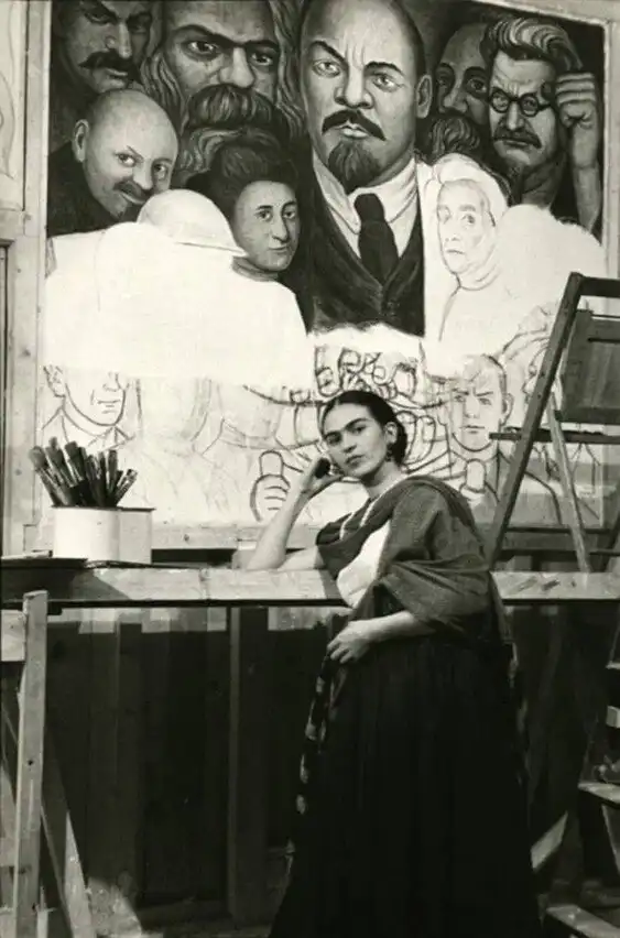 14. Фрида Кало перед незаконченным панно коммунистического единства, Нью-Йорк, 1933 год.