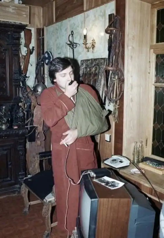 25. Александр Невзоров говорит по рации в своем доме, после покушения, 1990 год