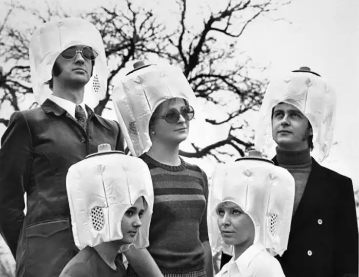 Группа мужчин и женщин, использующих чудаковатый фен для сушки волос, 70-е