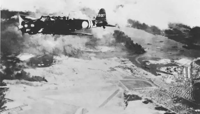Японский палубный бомбардировщик Накадзима B5N2 «Кейт». Снимок сделан 7-го декабря 1941-го года в 09:20 в период второй волны японского авианалета на Перл-Харбор.