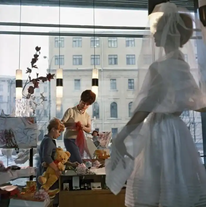 В магазине «Подарки» готовят витрину к 8 Марта. Фотография Исаака Тункеля, Дмитрия Ухтомского. 1967 год