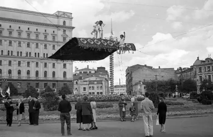 Ковёр–самолёт на Лубянке. Был установлен в 1957 году к VI Всемирному фестивалю молодёжи и студентов, а через год году на этом месте будет установлен памятник Дзержинскому. 1957 год