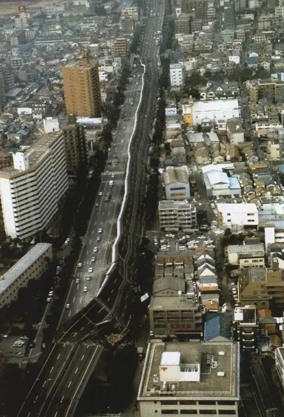 Часть рухнувшего скоростного шоссе Хансин после Великого хансинского землетрясения (или Землетрясение в Кобе), произошедшего 17 января 1995 года.
