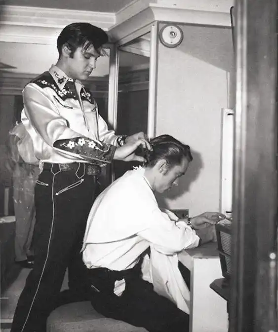 Элвис Пресли укладывает волосы Джонни Кэшу, 1960 год