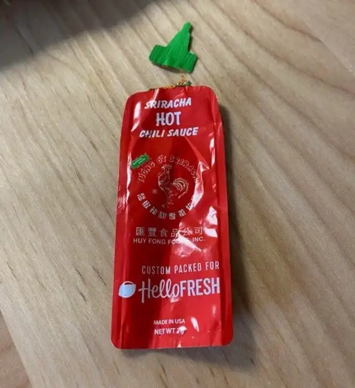 24. Одноразовый пакетик соуса Шрирача выглядит как настоящая бутылка, и даже с колпачком