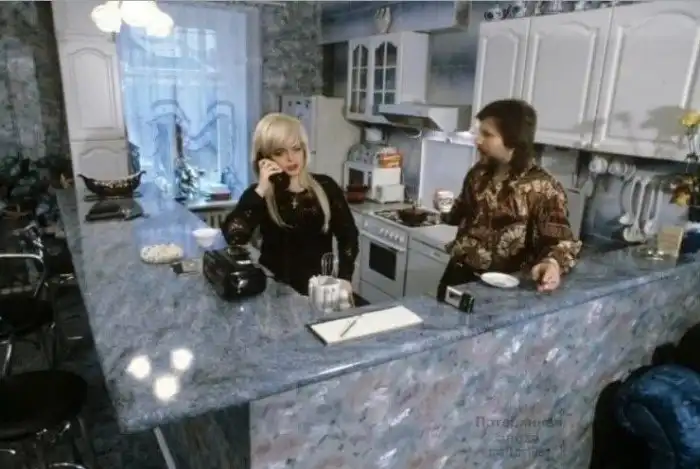 Лариса Долина беседует по телефону на своей кухне. 1994 год