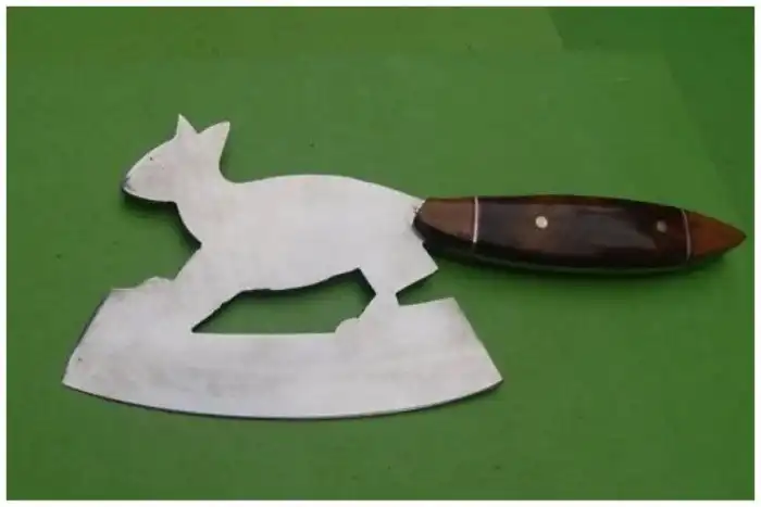 Узнать такой нож довольно легко — он имеет длинный массивный клинок с плавным изгибом в передней части.