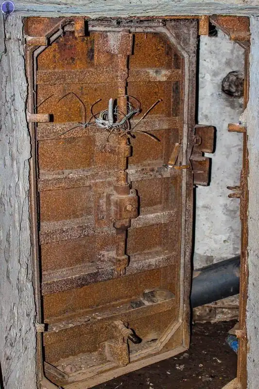 Её вес составляет более полутонны, а служила она как для предотвращения попадания в убежище взрывной волны, так и для препятствованию попадания внутрь герметичного контура отравляющих веществ, для чего по периметру полотно двери было снабжено резиновой вставкой в месте прилегания двери к коробу дверного проёма.