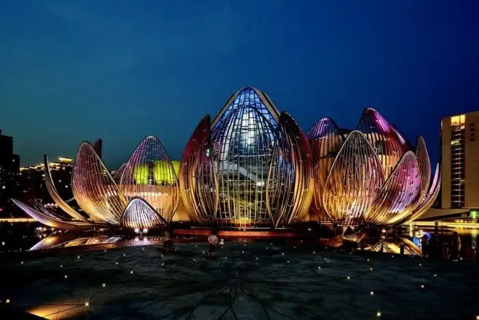 Цветущее из искусственного озера в центре Учжина, Китай, здание Лотос. Идея архитектора состояла в том, чтобы создать удивительную атмосферу, несмотря на погоду или сезон. В здании находятся отделы градостроительного бюро.