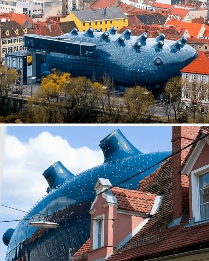 Известный как "Дружественный инопланетянин", Кунстхаус Грац - это галерея современного искусства. Форма здания напоминает сердце кита. Оно светится ночью, придавая дизайну фантастический вид. Здание расположено в городе Вена.