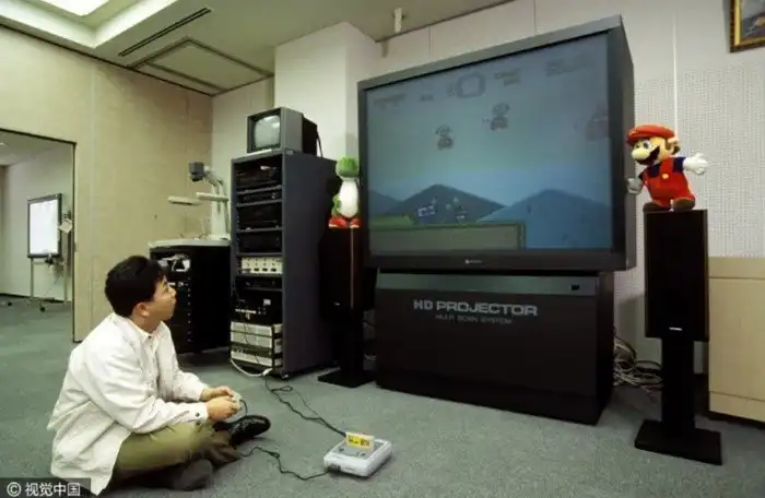 24. Сотрудник команды разработки Super Mario для SNES играет на большом проекционном телевизоре Hitachi, апрель 1992 год