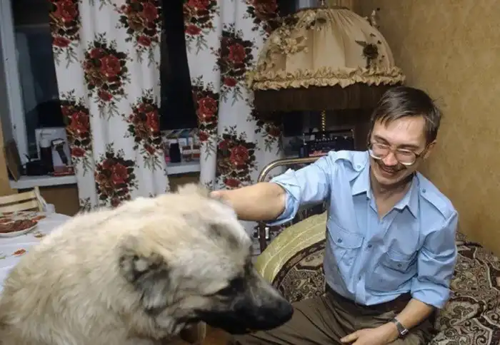 25. Создатель биржи «Алиса», будущий продавец гробов и хлеба высокой стоимости Герман Стерлигов со своей овчаркой Алисой у себя дома в Москве, 1992 год
