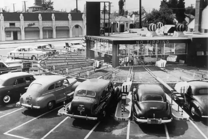27. Доставка еды к автомобилю на конвейере. США, 1950-е