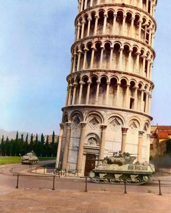 38. Танки армии США едут на фронт вокруг Пизанской башни, Италия, 6 сентября 1944 года