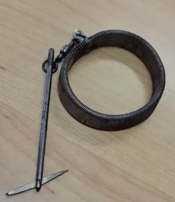 Это набор для занятий рукоделием или вышивкой. Катушка с нитками надевается на острие, а браслет — на запястье.