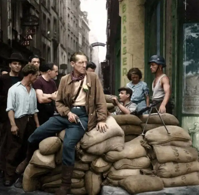 10. Французские бойцы Сопротивления человек на баррикаде в Париже, август 1944 год