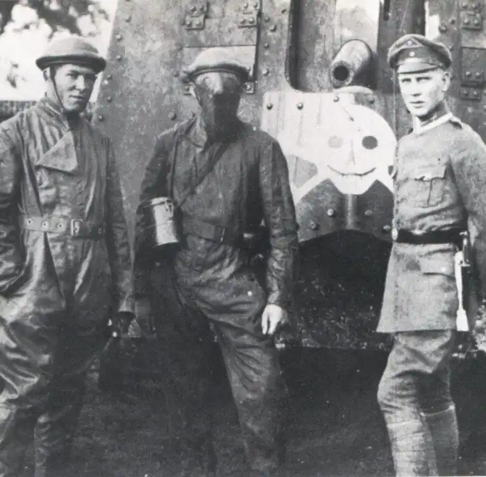 18. Экипаж немецкого танка A7V позирует на фоне своей боевой машины; 1918-й год