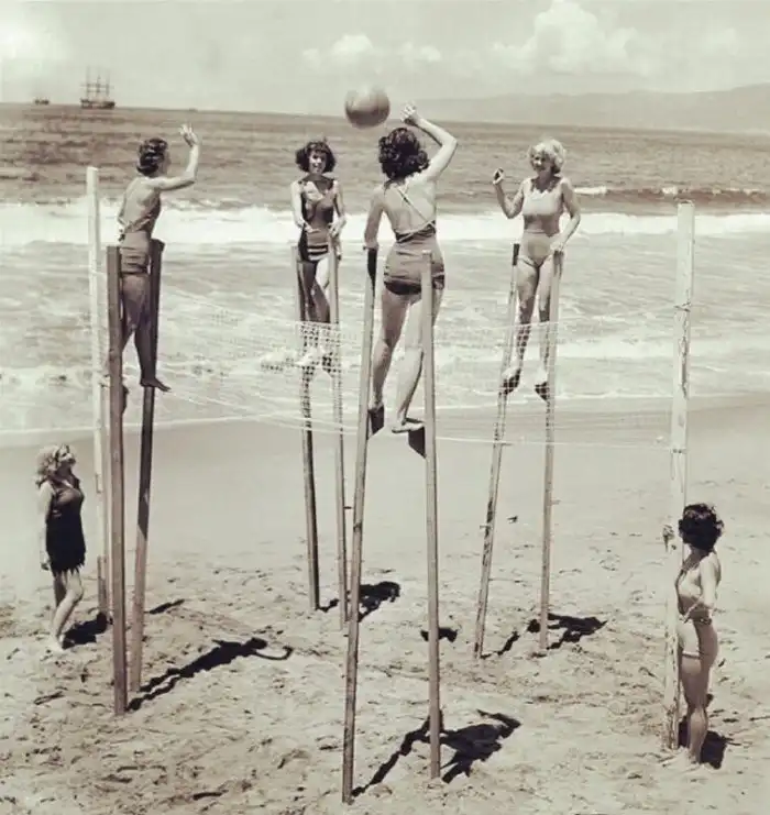 22. Девочки играют в волейбол на ходулях, Венис-Бич, 1934 год