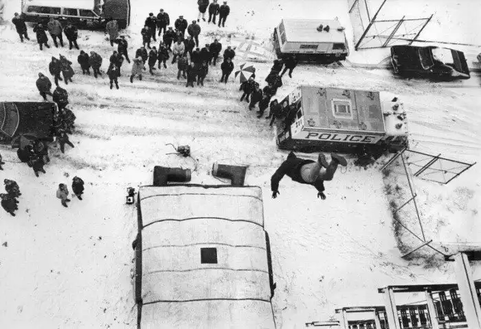 32. Каскадёр Дар Робертсон прыгает из окна семиэтажного дома, чтобы продемонстрировать новое спасательное устройство - надувной мешок, который был создан для спасения жизни людей в случае пожара, 25 февраля 1974 года