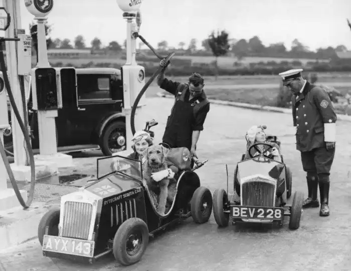 33. Микроавтомобили, разработанные Дж. В. Шилламом, на заправочной станции недалеко от Барнета, 1934 год