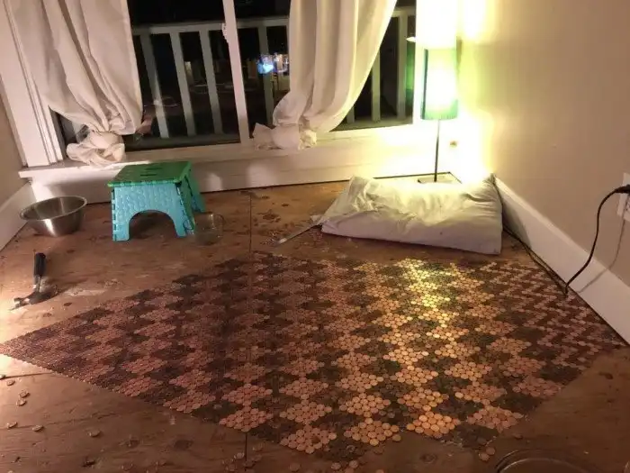 Понадобилось примерно 130$ по одному пенни, 10 бутылок клея, эпоксидная смола и затирка. А ещё моя собака постоянно норовила сюда проникнуть!