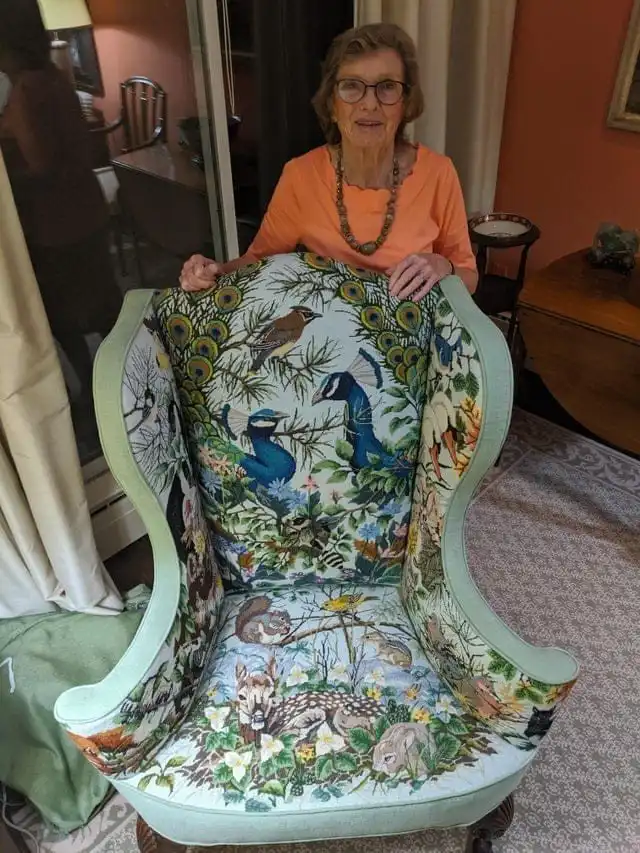 Все эти узоры она придумывала и вышивала сама. Она даже купила павлина, чтобы правильно подобрать цвета ниток! Сидеть в этом кресле мне не разрешают.