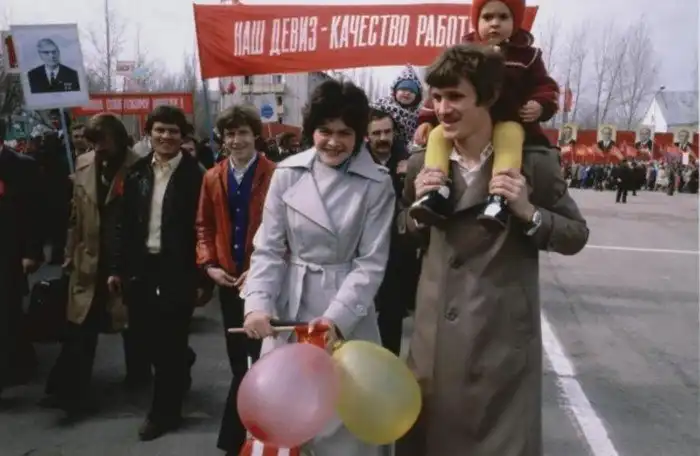 Люди собирались сначала на одну большую демонстрацию, а потом разбивались на компании, продолжая весело праздновать с друзьями и родными. А весь город был украшен транспарантами, лентами, воздушными шарами и цветами.