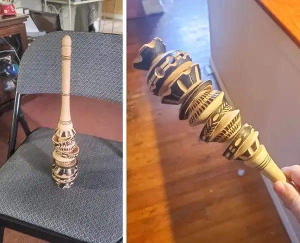 «Деревянный предмет с резьбой и деревянными кольцами, которые не снимаются. Нашел это в парке»