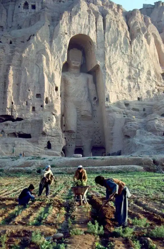22. Фермеры работают под Великим Буддой 4-5 веков в Бамиане, Афганистан, 1992 г. (разрушен талибами в 2001 г.)