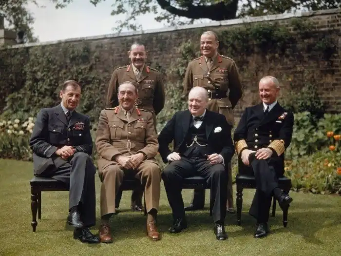 25. Уинстон Черчилль со своими начальниками штабов в саду Даунинг-стрит № 10. Рады победе