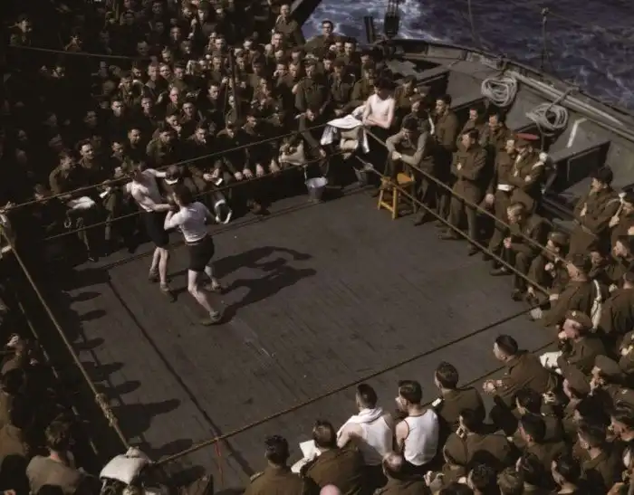 37. Советский матрос Дмитрий Коротич через мгновение отправит в нокаут английского боцмана Томаса Рейли во время товарищеского боксерского матча между английскими и советскими моряками, Балтийское море, май 1945-го