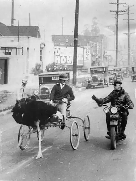 8. Полицейский останавливает повозку запряженную страусом. Лос-Анджелес в начале 1930-х
