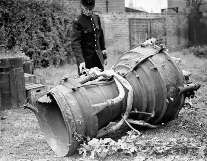 9. Полицейский осматривает остатки ракеты ФАУ-2, поразившей Лондон, Англия, сентябрь 1944 года