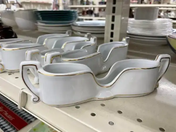 Прибор из белого фарфора, обрамленный золотом, с ручками и выемкой посередине