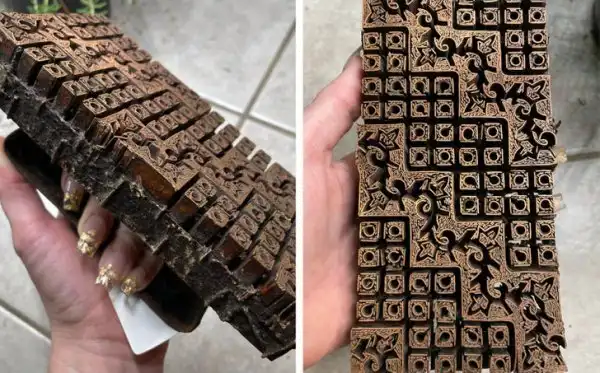 Ответ: Похоже на трафарет для индийского батика или росписи по ткани. В него заливают воск, пропитывают им шелковую ткань, делая определенные участки устойчивыми к красителю, и окрашивают не пропитанные воском части материала.