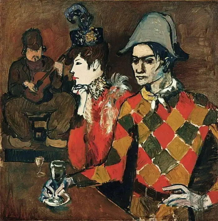 Пикассо в образе арлекина в 1905 году в более радостный период жизни: тогда он часто рисовал артистов
