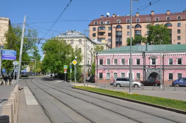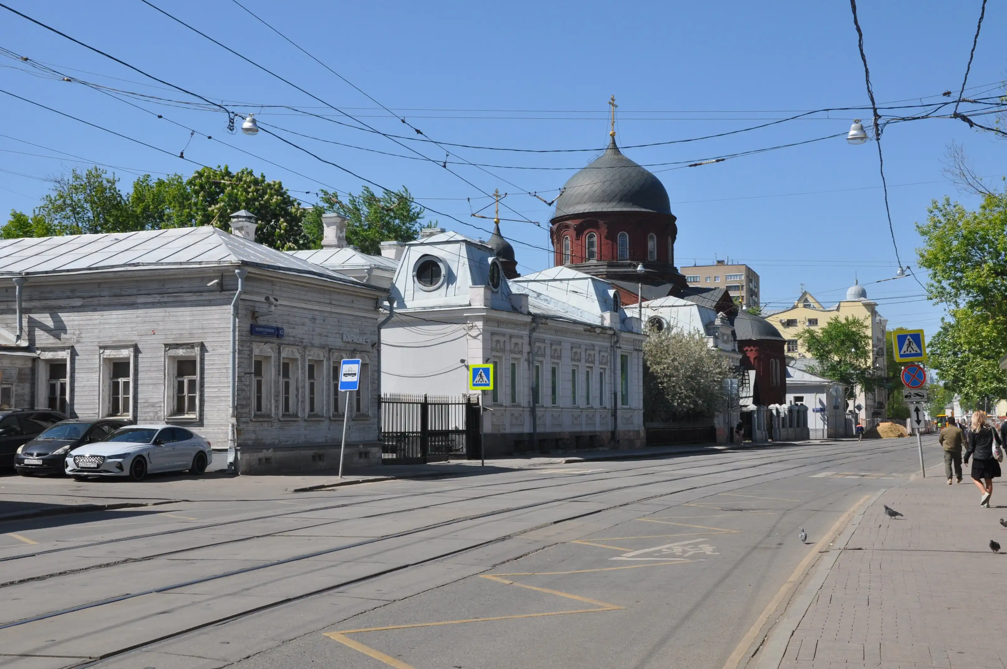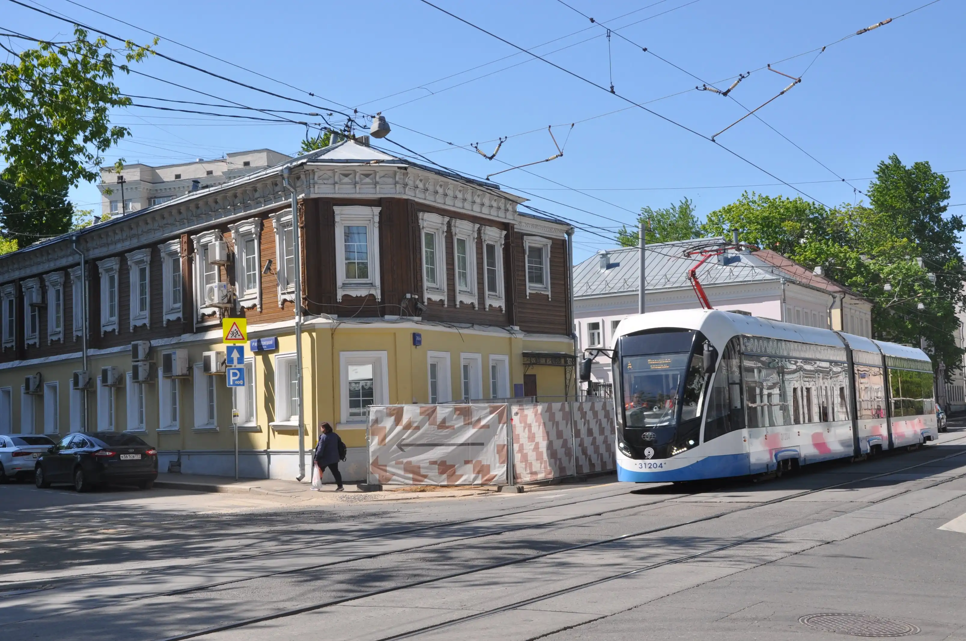Старая двухэтажная купеческая Москва и современный трамвай.