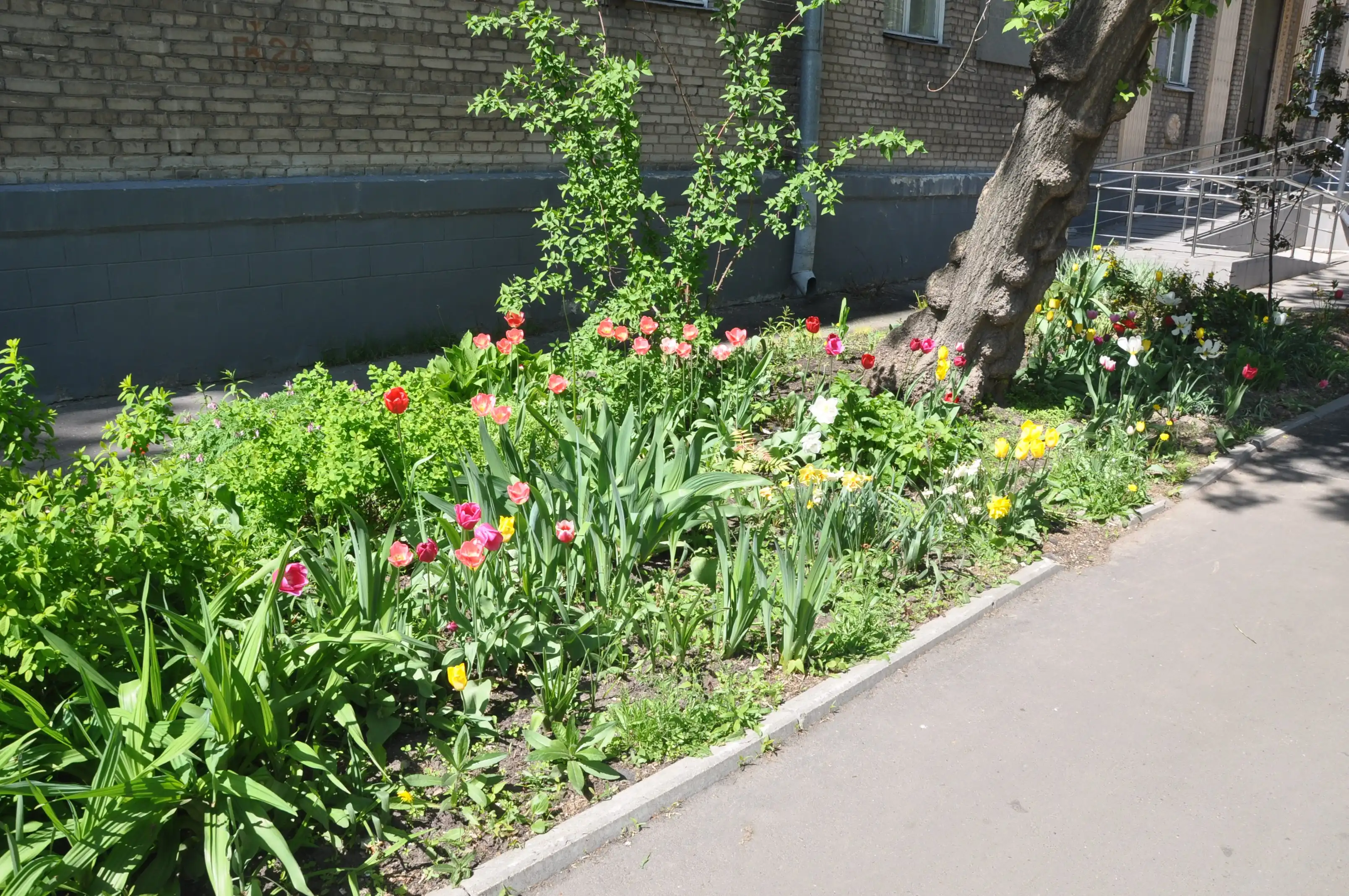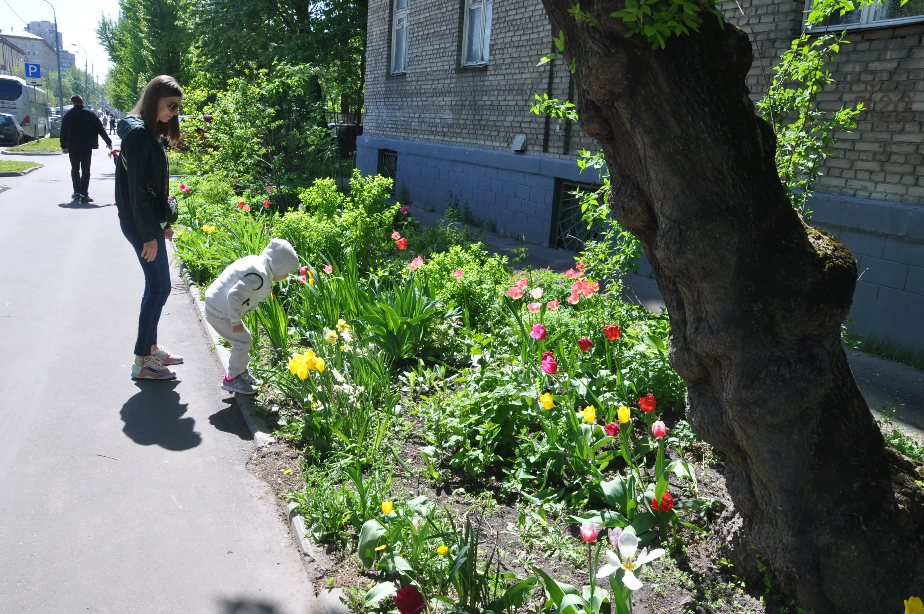 Под конец прогулки перенесёмся на ВДНХ, Ракетный бульвар… Здесь на клумбах перед домами расцвели тюльпаны и разные красивые весенние цветы… Народ ходит – радуется…