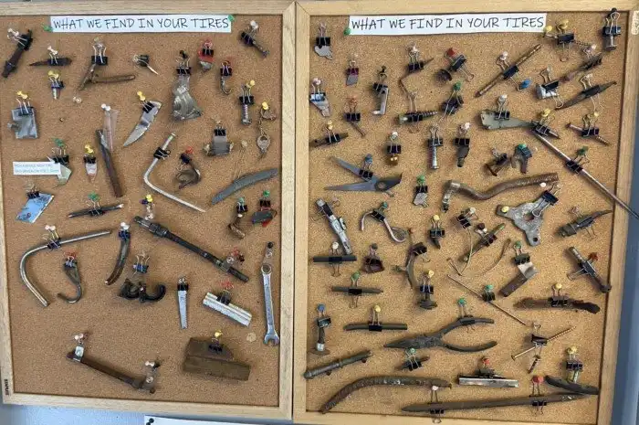18. Коллекция предметов, извлечённых из шин в автомастерской