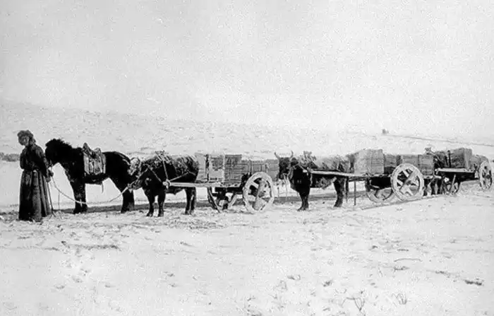 Дорога от Кяхты (русский торговый город на границе с Монголией) до Москвы в середине XIX века составляла 5555 верст. Три месяца пути чайного обоза стоили от 4 до 8 руб. с пуда. Россия закупала 360 тысяч пудов чая в год на сумму 5–6 миллионов рублей. Больше половины всех мехов, вывозимых из страны, шло в Китай в обмен на чай.
