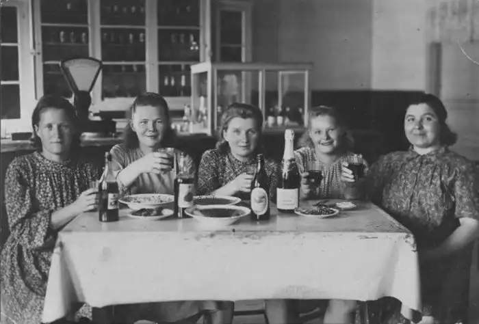 39. За праздничным столом. Работницы магазина после закрытия решили что-то отметить, 1930 год