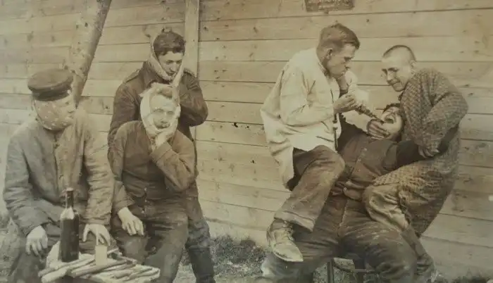 Немецкий полевой дантист во время Первой мировой войны за работой.
