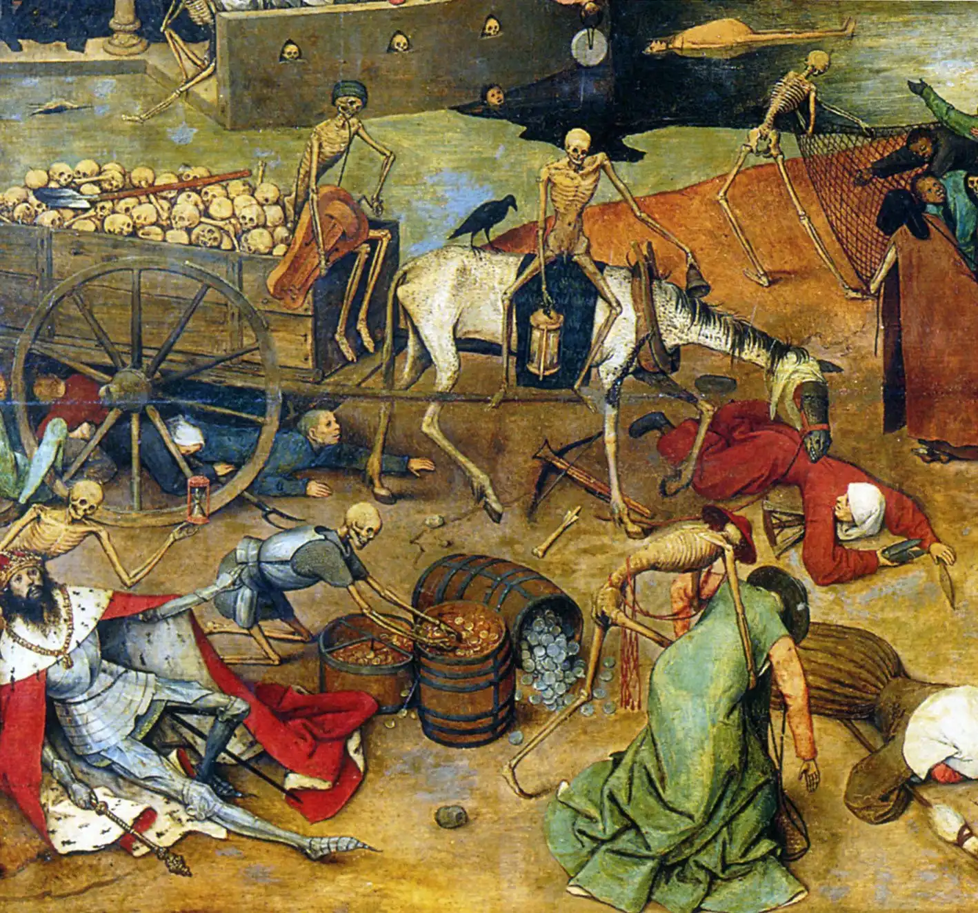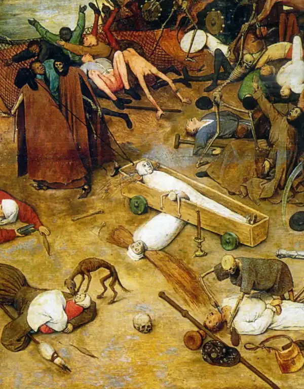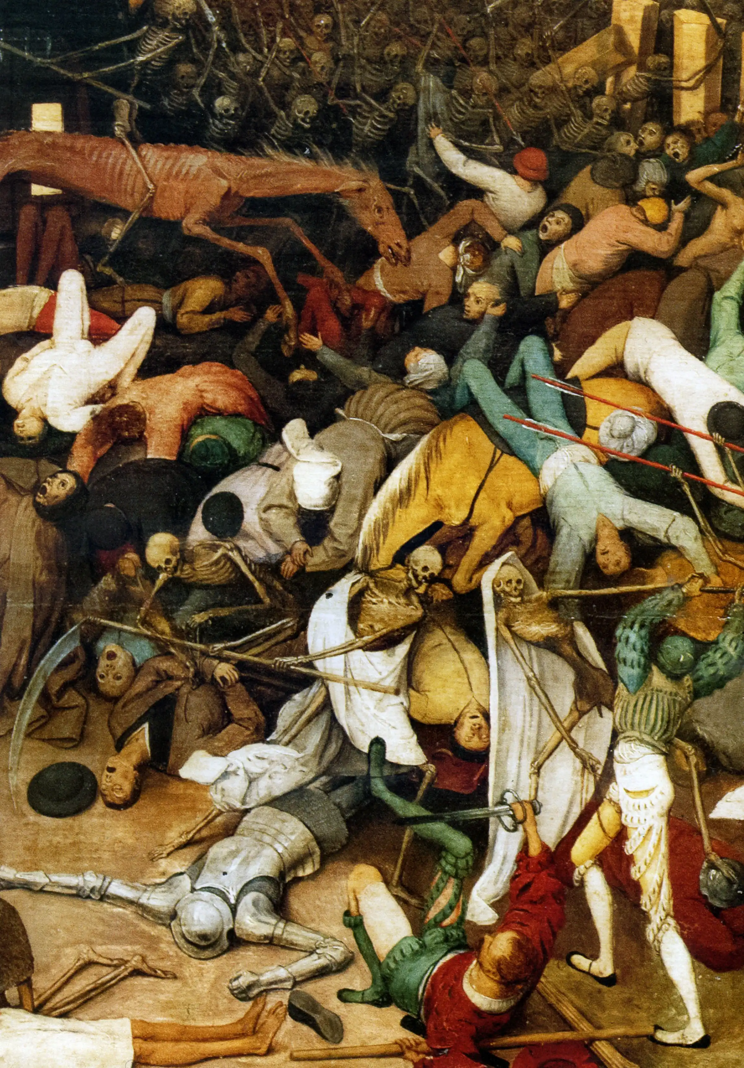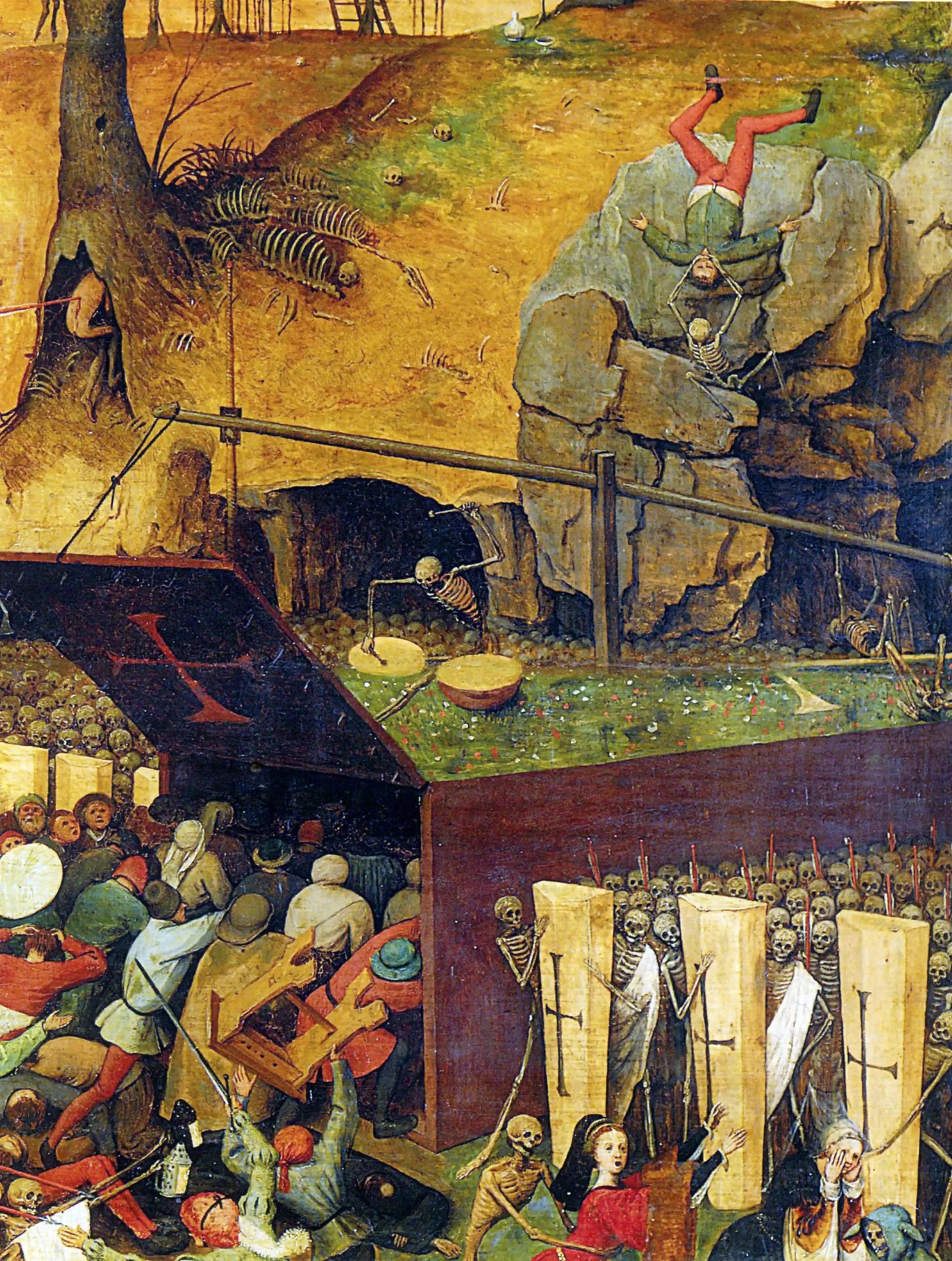 Мотивы смерти – иконографическая традиция, в которой изображались хороводы скелетов, вовлекающих в свою безумную пляску ещё живых людей, как правило, знатных или богатых. “Брейгелевская смерть” не столь однозначна. Она не только косит людей, но и мрачно шутит над ними. “Панорамный взгляд” художника на людей – сверху! – сообщает мёртвому или живому сообществу не только трагический, но и жалкий оттенок из-за фатальной невозможности оказать сопротивление вездесущей Смерти. Трагична сценка с милующимися возлюбленными, которым осталось жить мгновение-другое…
