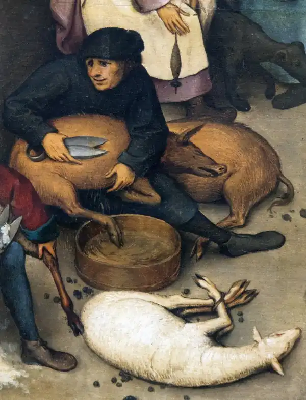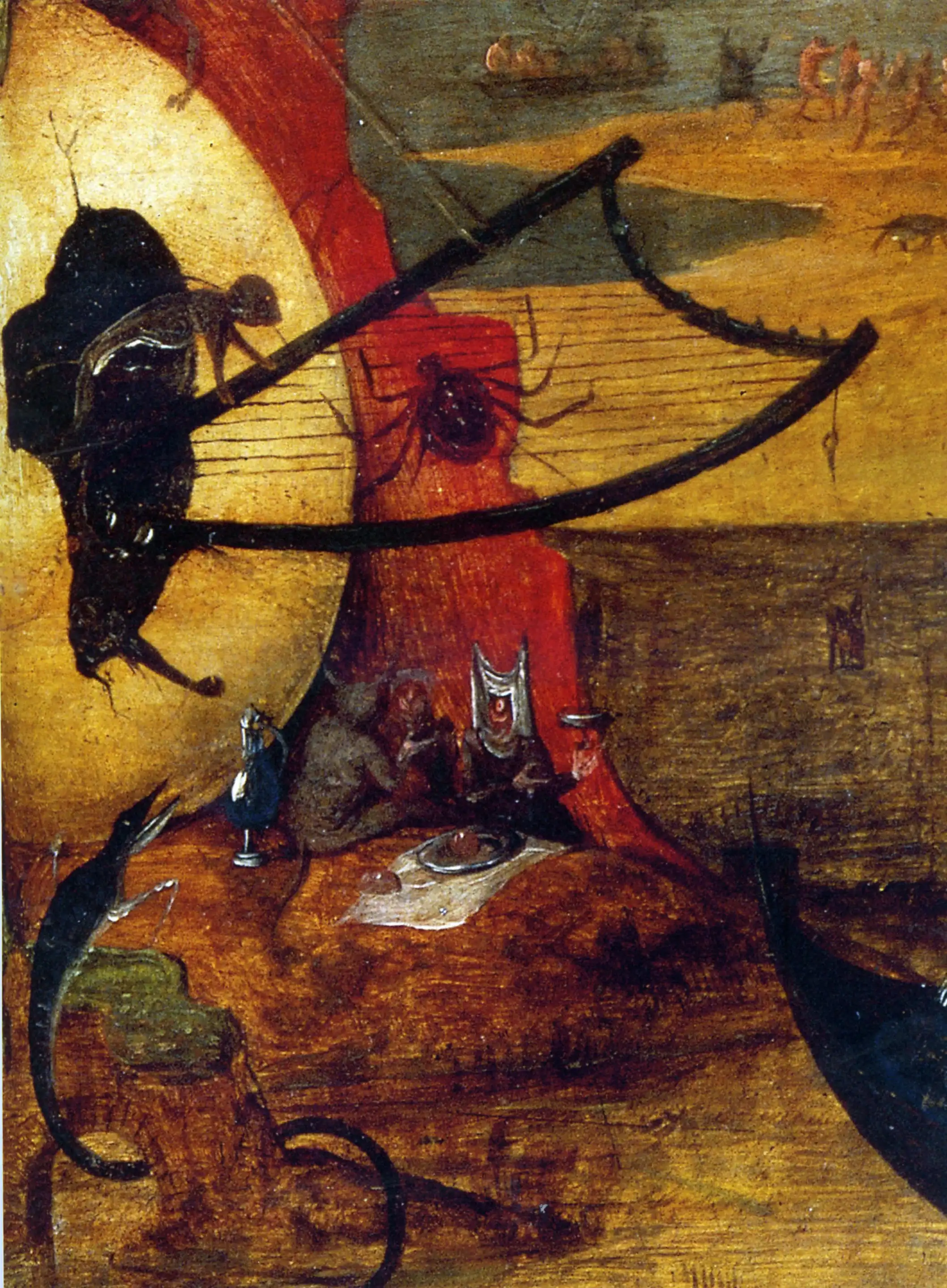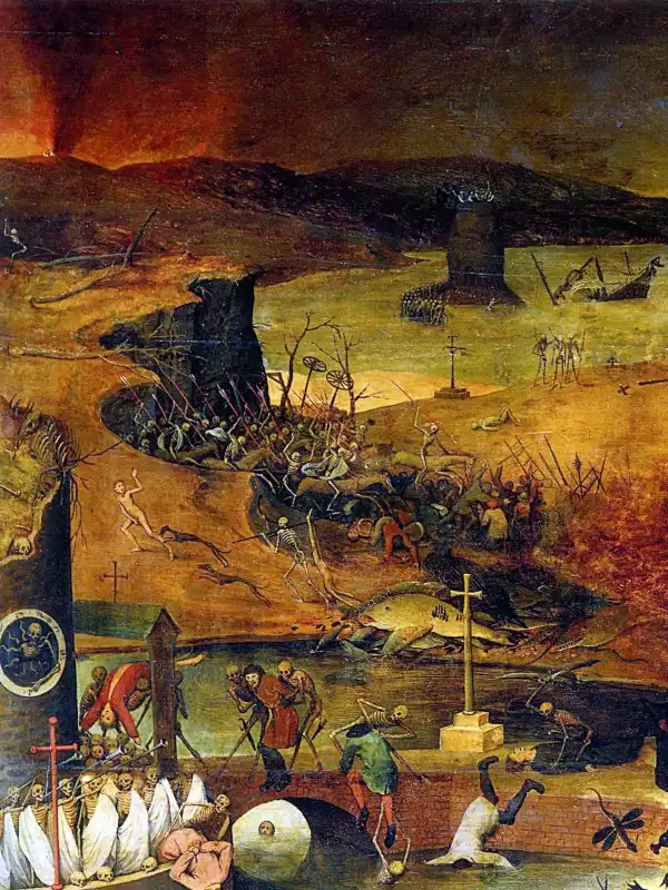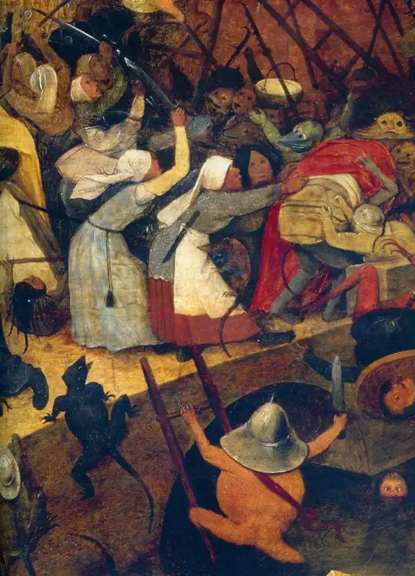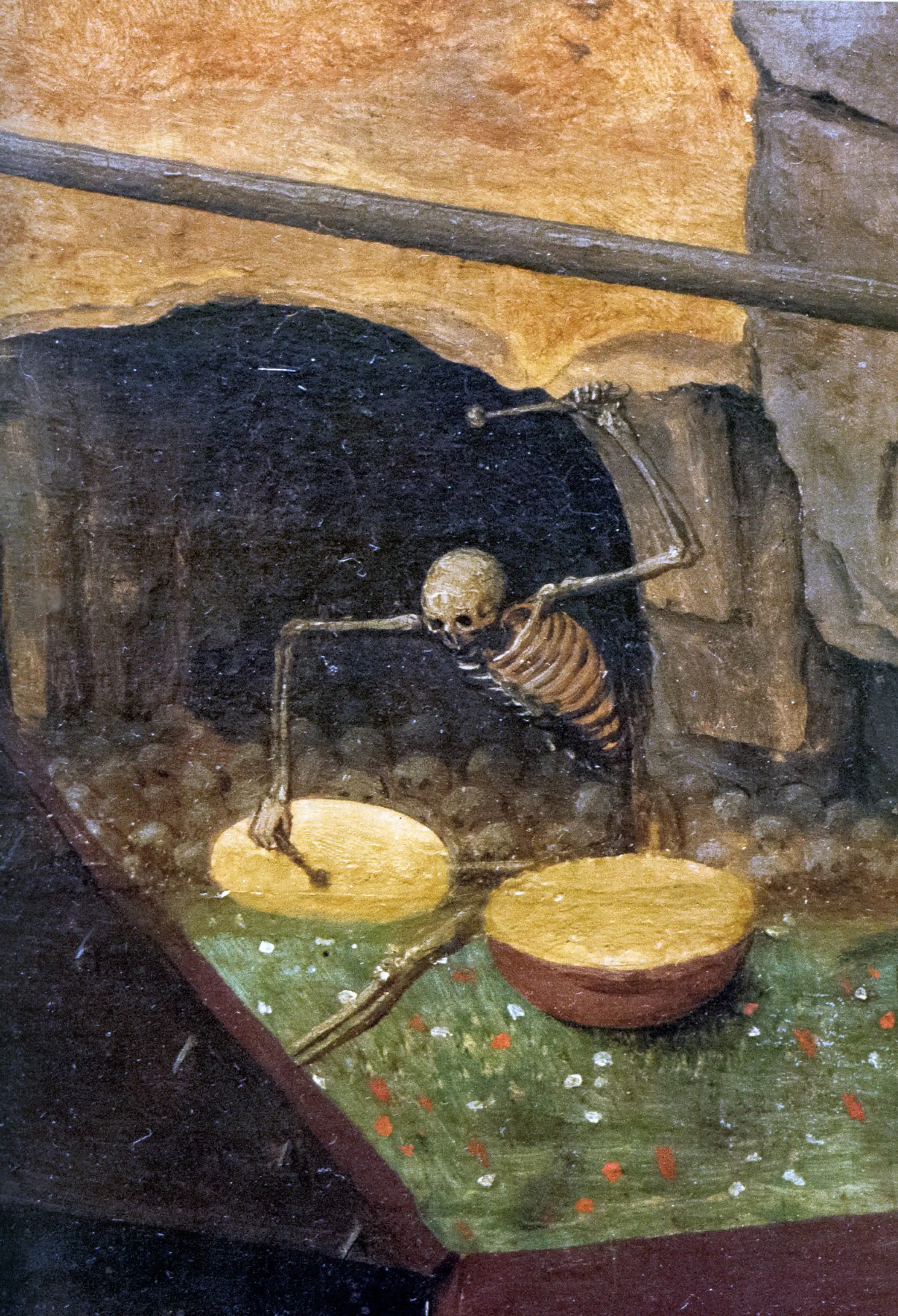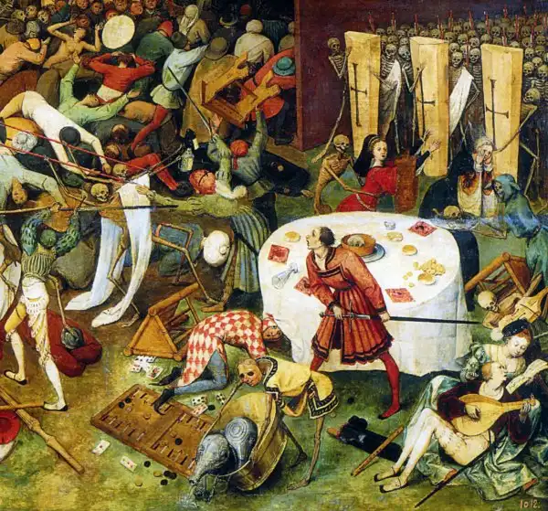 Мотивы смерти – иконографическая традиция, в которой изображались хороводы скелетов, вовлекающих в свою безумную пляску ещё живых людей, как правило, знатных или богатых. “Брейгелевская смерть” не столь однозначна. Она не только косит людей, но и мрачно шутит над ними. “Панорамный взгляд” художника на людей – сверху! – сообщает мёртвому или живому сообществу не только трагический, но и жалкий оттенок из-за фатальной невозможности оказать сопротивление вездесущей Смерти. Трагична сценка с милующимися возлюбленными, которым осталось жить мгновение-другое…