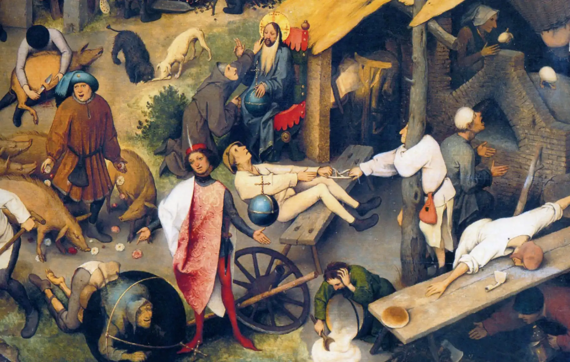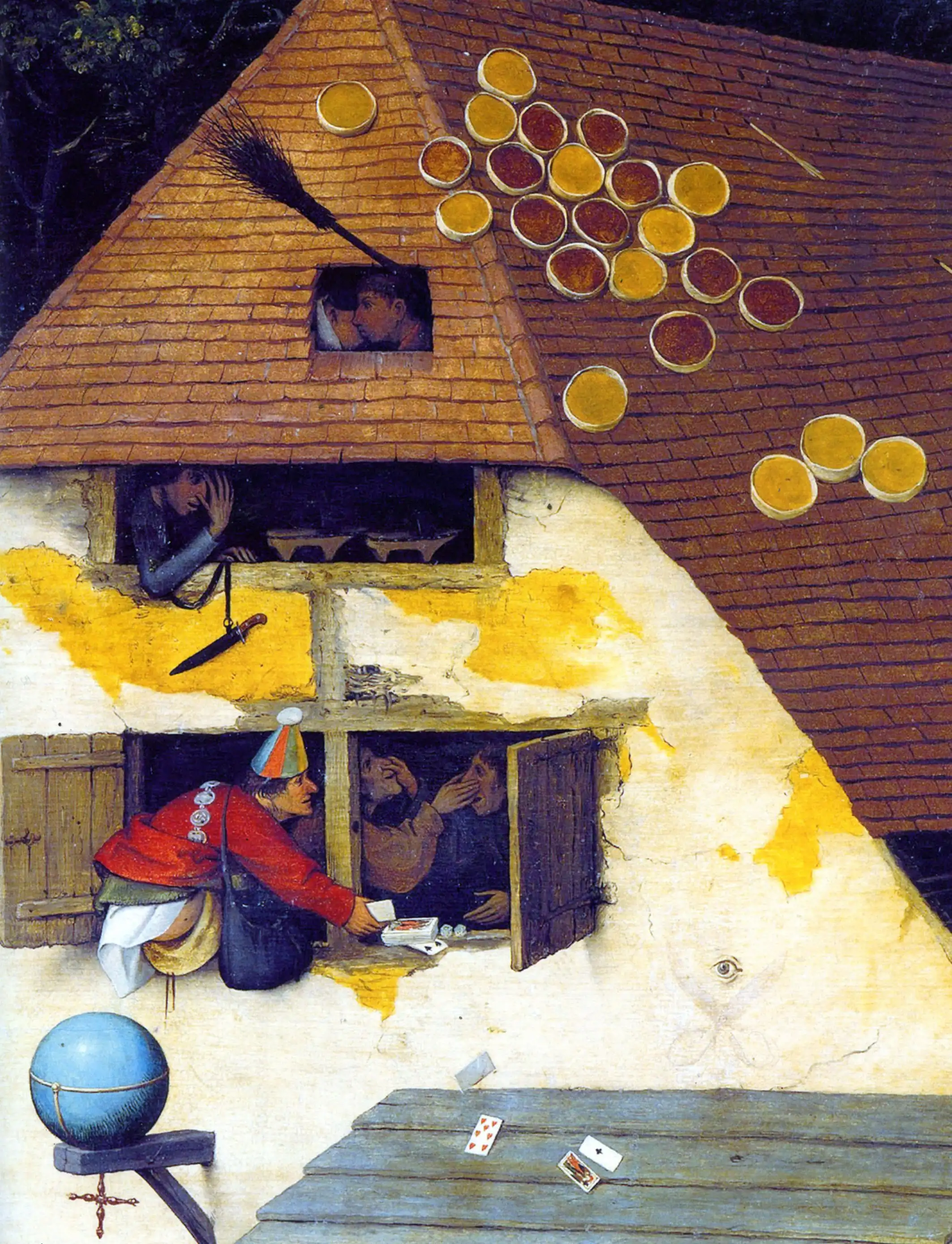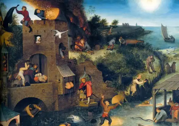 Нидерландские пословицы кажутся каким-то выходом в другую реальность. Возможно, художник, открывая нам греховную жизнь своих современников, написал полотно… в назидание. Вековая мудрость пословиц, проиллюстрированных “обратным образом”, создают атмосферу жизни, где правит добро. Смотрите, что с вами стало – говорит художник. Но вернитесь к праведности и безгрешности, будьте мудрыми – и жизнь изменится…