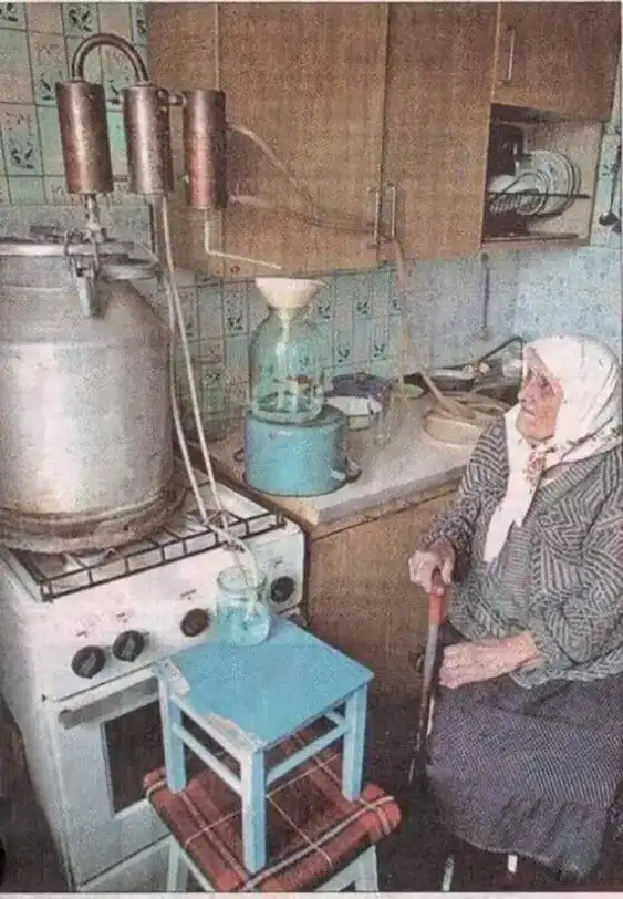 11. Бабуля следит за процессом самогоноварения. СССР, 1980-е. Тогда за такое дело могли посадить в тюрьму до 3 лет.