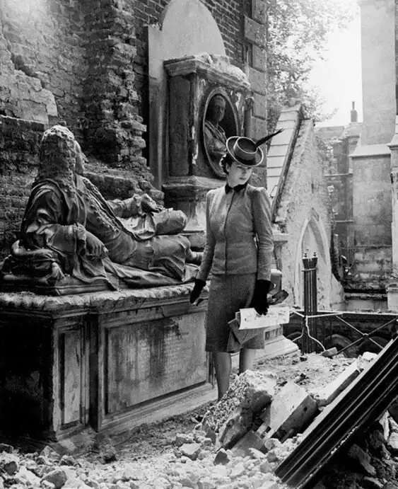 На одной из самых известных фотографий времен Второй мировой войны изображена женщина, стоящая в руинах разрушенного бомбардировками дома. Она одета в безупречный костюм, шляпу и перчатки — ее наряд демонстрирует шик и элегантность 1940-х годов. Автор снимка – английский модный фотограф Сесил Битон, проявивший себя как проницательный репортер. Этим кадром он пытался продемонстрировать, что жизнь женщин продолжается, хотя и, безусловно, под гнетом обстоятельств окружающего мира.